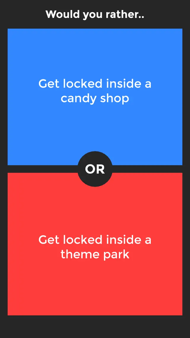 Fri Aug 12 2022 annak6763hello! This is the third and hopefully last time I tried to get the right words for this app. Well, there are some good things about it. Number one: if you are playing would you rather with your friend(s) and you run out of ideas you can pull up this app on your phone or iPad. Number two: if you’re just in the car and don’t really have much else to do this is a good time killer. Or if you just need to kill some time. It doesn’t really matter what you are waiting for. then, the only problem is that you have to pay for more questions and there’s a really Limited amount.. but that’s kind of a big problem!! 😞💔 please add more questions and read my suggestions-Number one! would you rather kiss a frog or kiss a snake? Would you rather jump in a river of mud or A river of Jell-O? Would you rather eat spaghetti for a straight week or McDonald’s for a straight week?(if you’re a boy) would you rather paint your nails pink or do your make up in any color? would you rather sleep for three hours or sleep for 300? thank you so much for reading! it took me a long time to write this and a very long time to write all three. Also this idea to send suggestions for a would you rather was from a different review! Buy and please fix the game 💔❤️🆘 (: 💕💕💕
