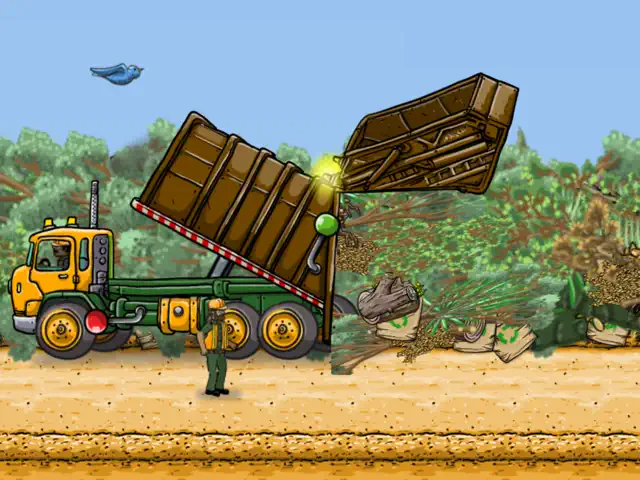 Ride along on a Brushy Pick Up Garbage Truck as it drives through a neighborhood and stops to pick up limbs, brush, stick bundles, leaf cans and lawn bags. Pick up the brushy items yourself and drag or drop them into the hopper. Tap the garbage man to have him help pick up the brushy items also. Use the green knob on the side of the truck to operate the truck's compactor to squish the garbage. After three pick ups, visit the Compost Site to empty the truck! Then drive the Giant Compactor Truck to mash down a huge pile of brush!