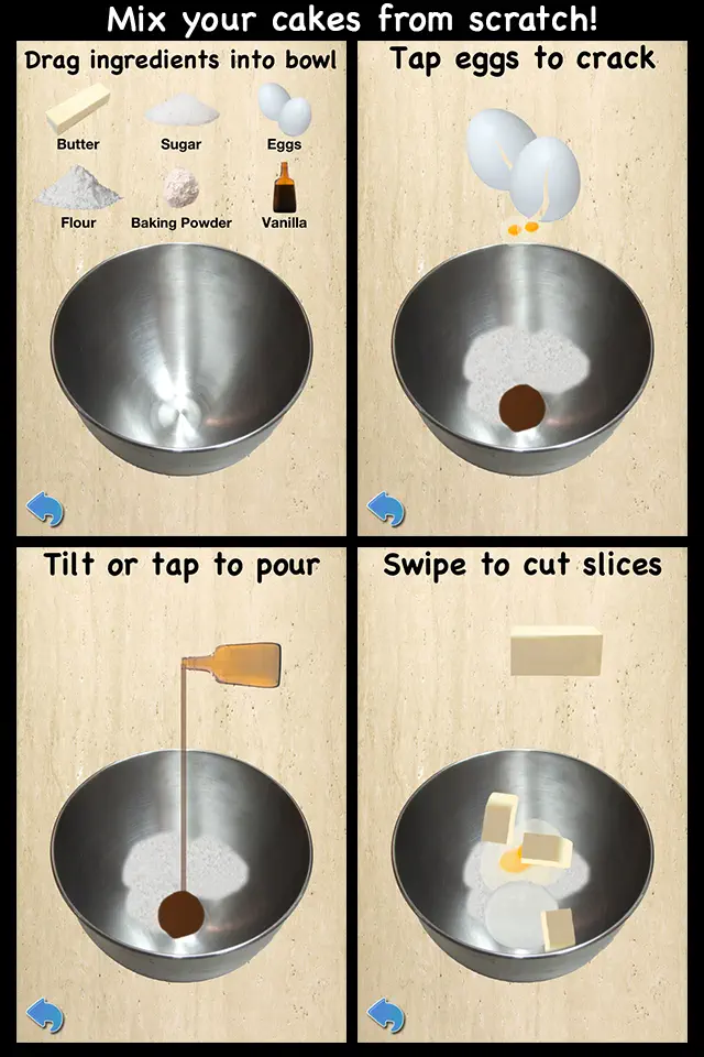 Select a recipe and mix the ingredients by tapping and dragging. Pour the batter into your chosen pan shape and put it in the oven.