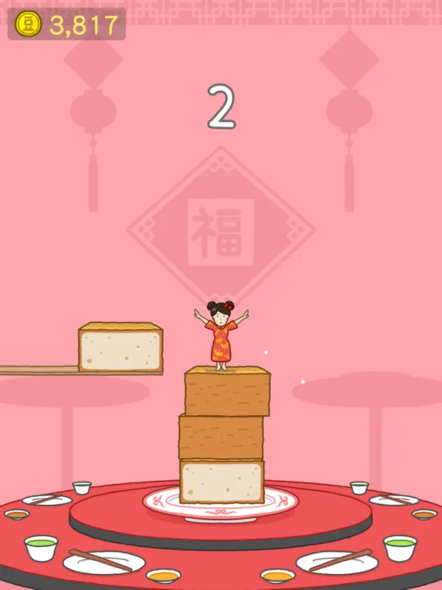 The objective of the game is to jump on top of the tofu blocks without getting knocked over! You try to make the tallest tofu tower possible.
