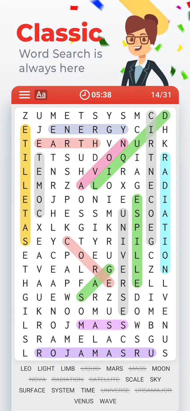Word Search Colorful is a vibrant and exceptionally polished version of the time-tested word find puzzle. What elevates this version, as an expert in casual puzzle design, is its focus on sensory feedback. The way each found word highlights in a different neon color creates a 'visual garden' on your screen by the end of the match. It’s a small touch, but it makes the experience significantly more rewarding than a standard monochrome grid.